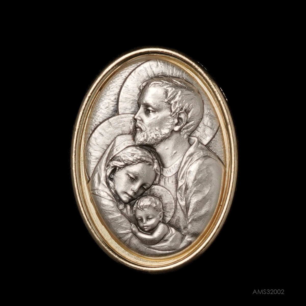 Aksesoris mobil ini memiliki bentuk oval polos dengan ukiran Keluarga Kudus. Memiliki desain yang simpel. Digunakan dengan cara ditempel pada bagian tertentu di mobil anda karena di sisi belakang pada aksesoris mobil ini terdapat magnet.