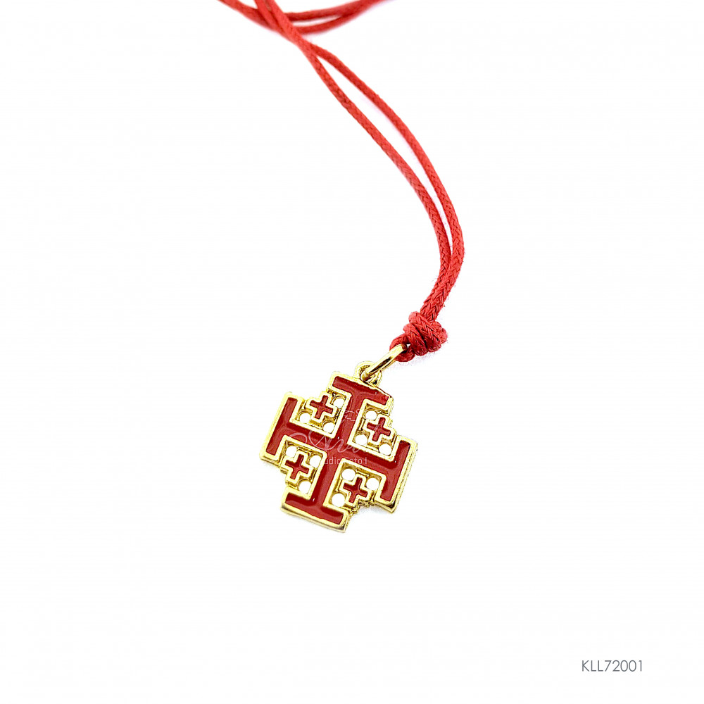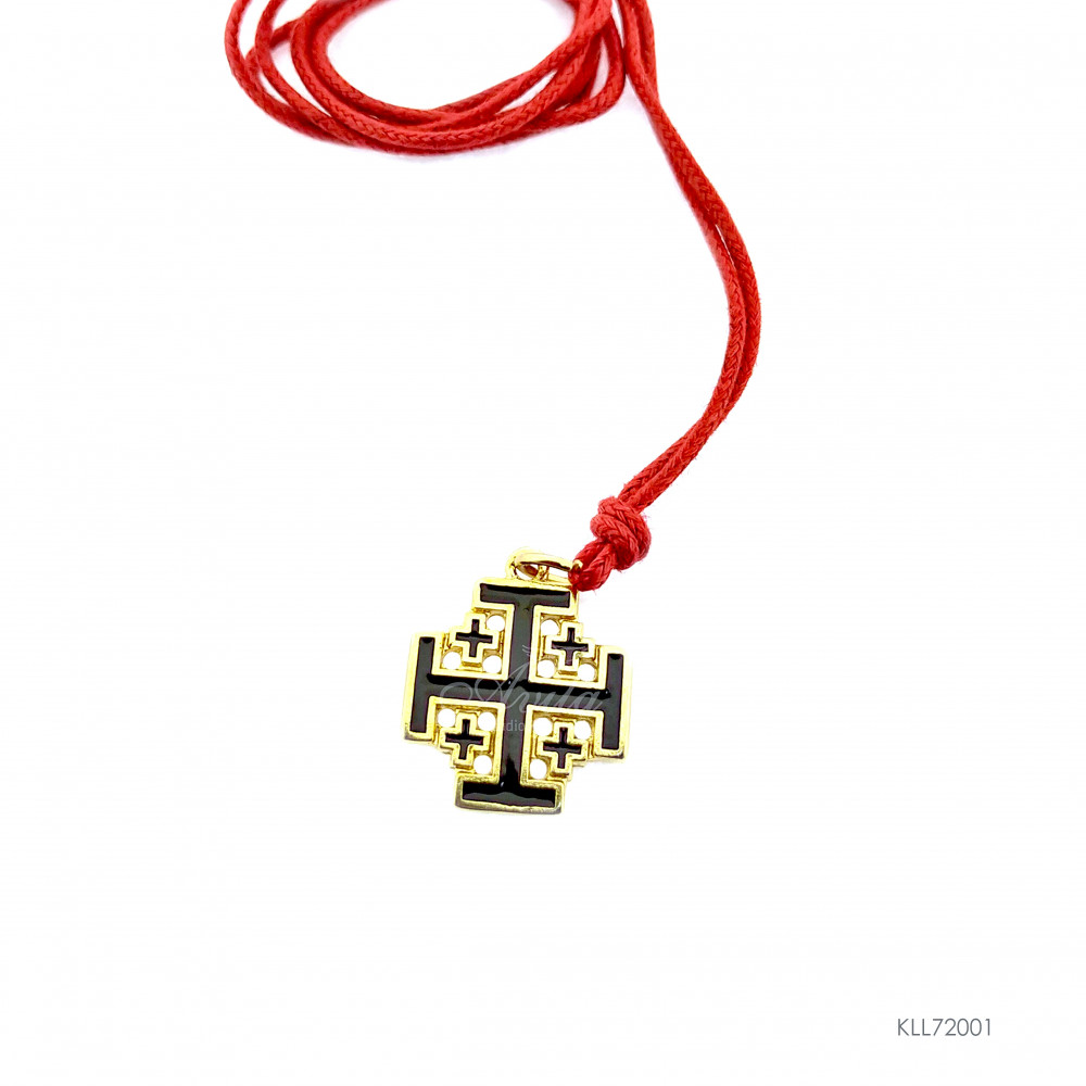 Kalung salib ini memiliki tali yang kuat. Liontin ini juga dinamakan dengan salib Yerusalem dengan unsur warna emas. Terdapat 2 warna enamel, yaitu hitam dan merah.