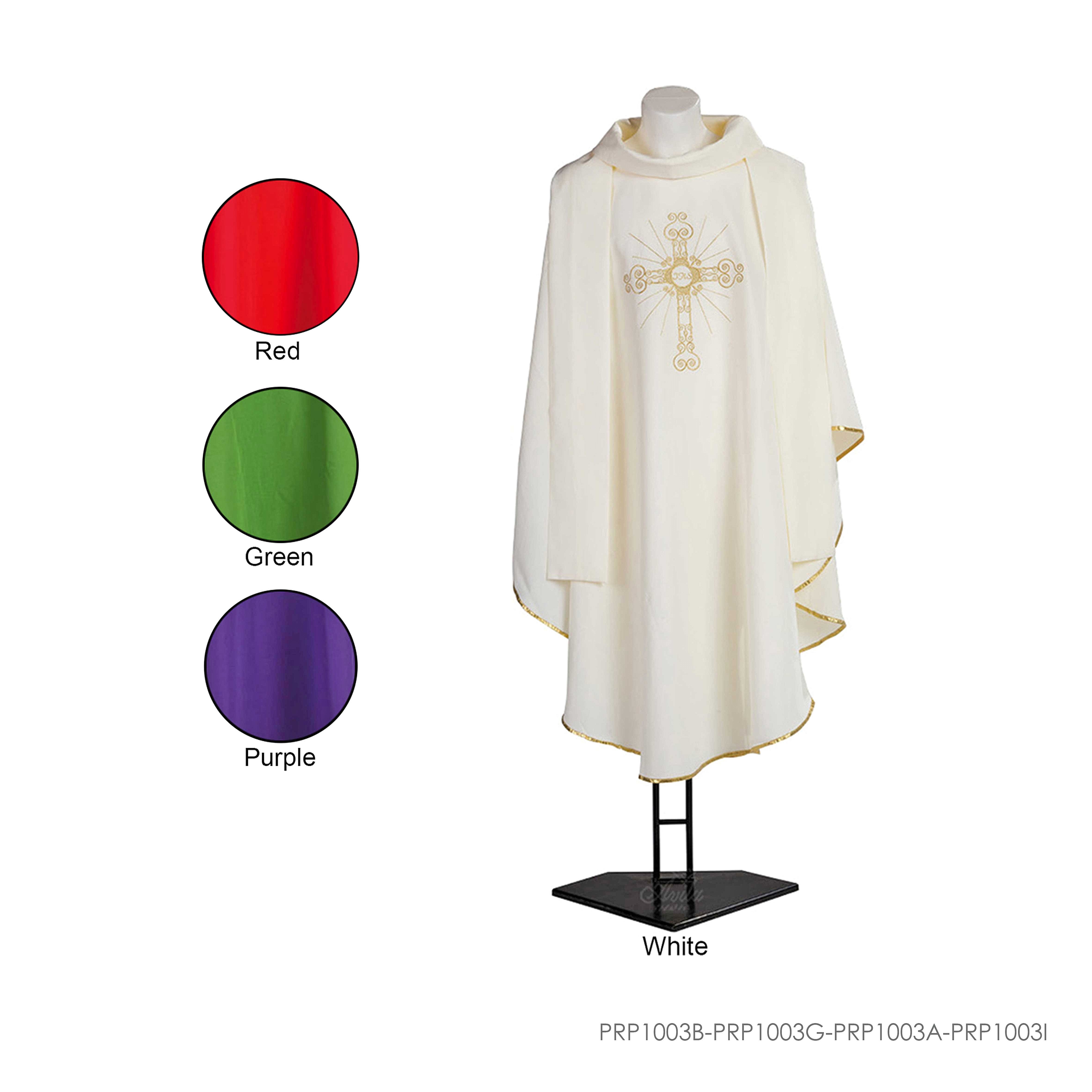 Kasula ini memiliki berbagai macam warna mulai dari putih, merah, hijau, dan ungu. Kasula ini memiliki bordiran salib abstrak.