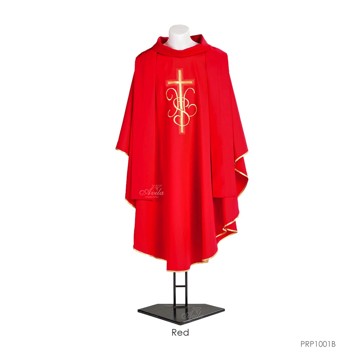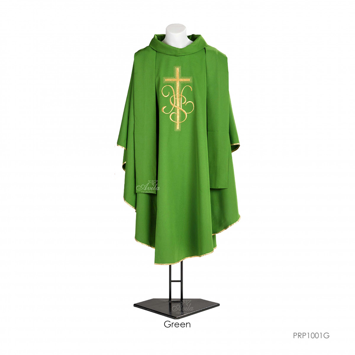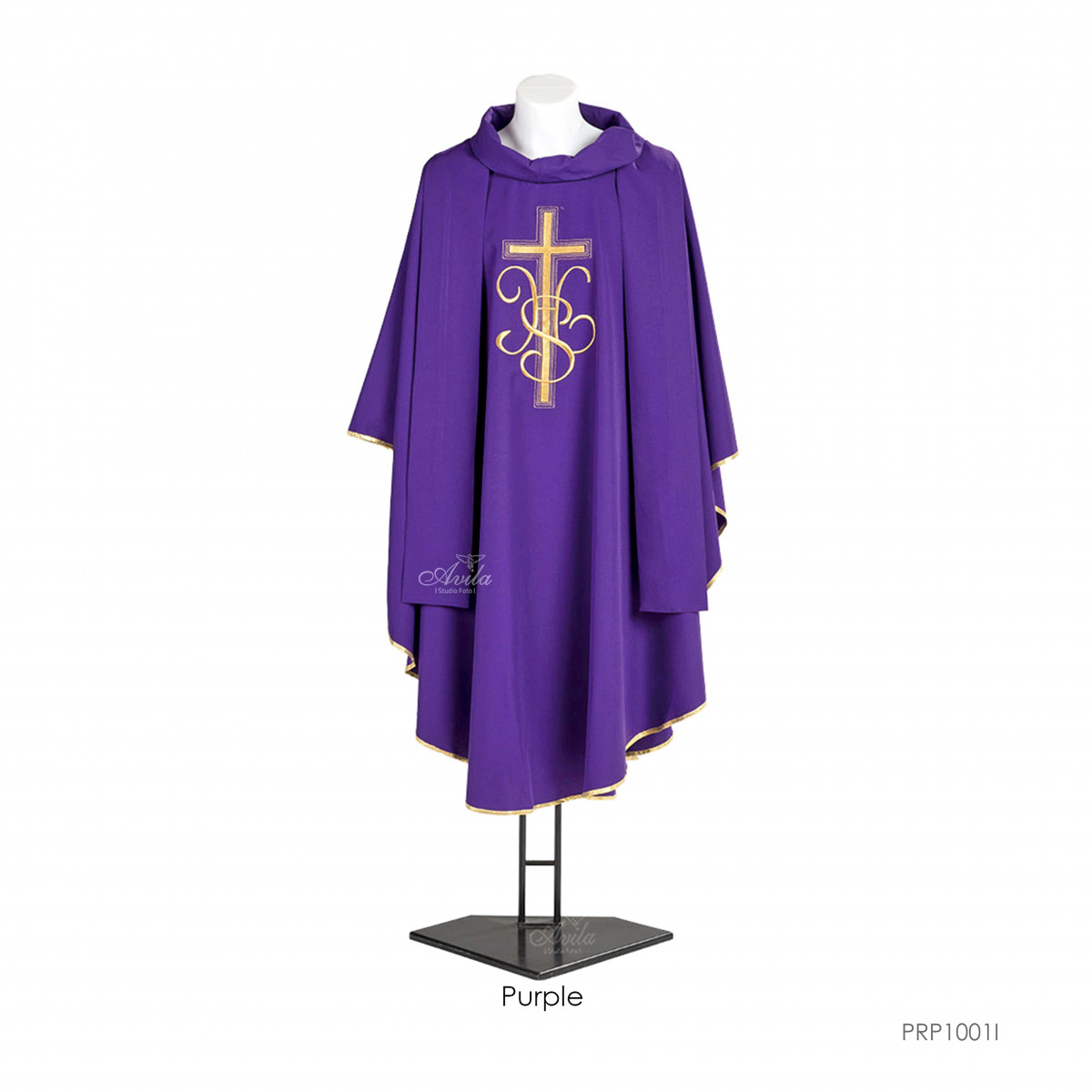 Kasula ini memiliki berbagai macam warna mulai dari putih, merah, hijau, dan ungu. Kasula ini memiliki bordiran salib dalam lambang IHS.