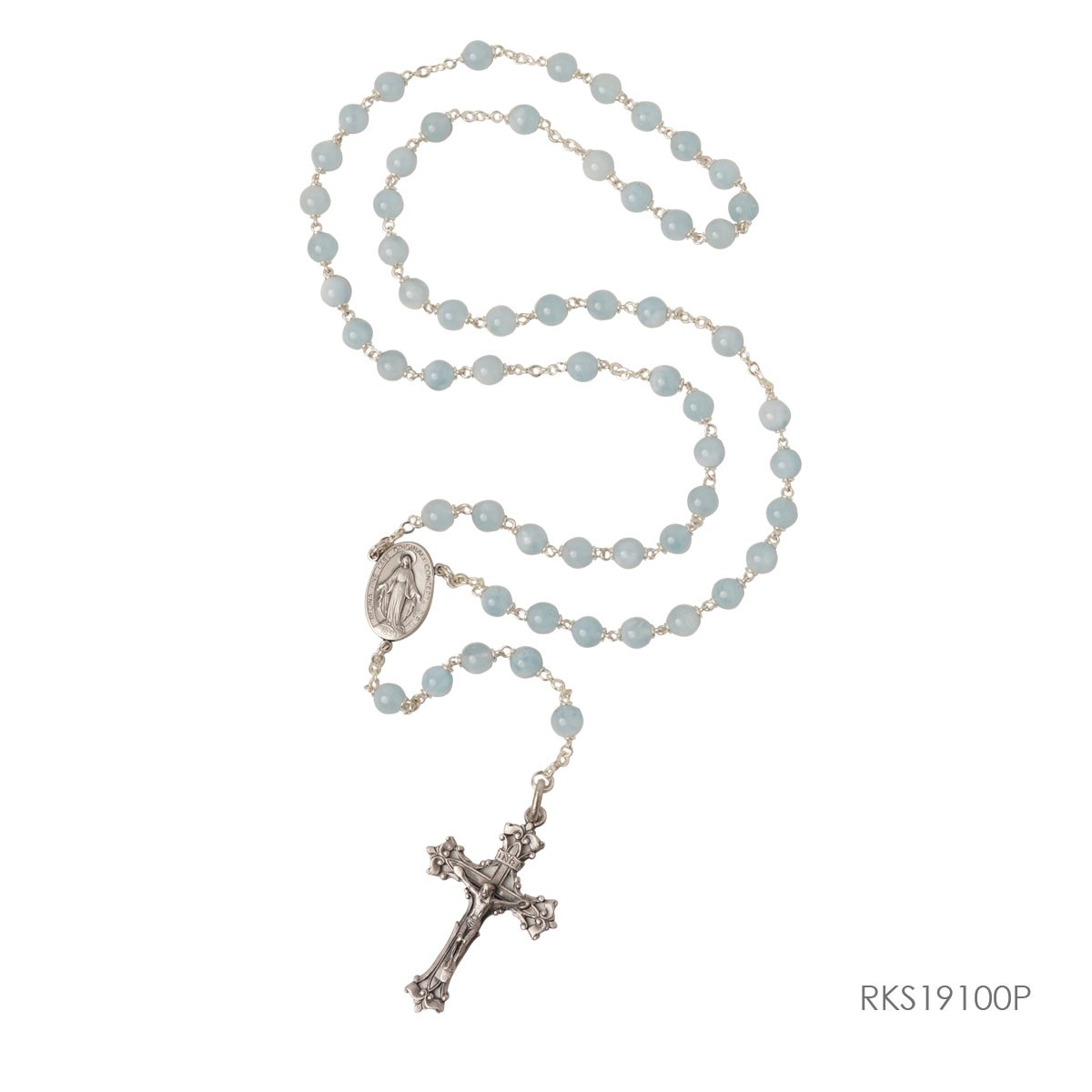 Rosario ini terbuat dari batu aquamarine, center dan salibnya berbahan silver argento. Batu aquamarine adalah batu permata yang terkenal dengan warna biru muda yang lembut, menyerupai warna air laut. Nama "aquamarine" berasal dari bahasa Latin yang berarti "air laut," mencerminkan keindahan dan kesegaran warna batu ini. Aquamarine adalah batu kelahiran untuk orang yang lahir di bulan Maret, dan sering kali diasosiasikan dengan berbagai makna positif.