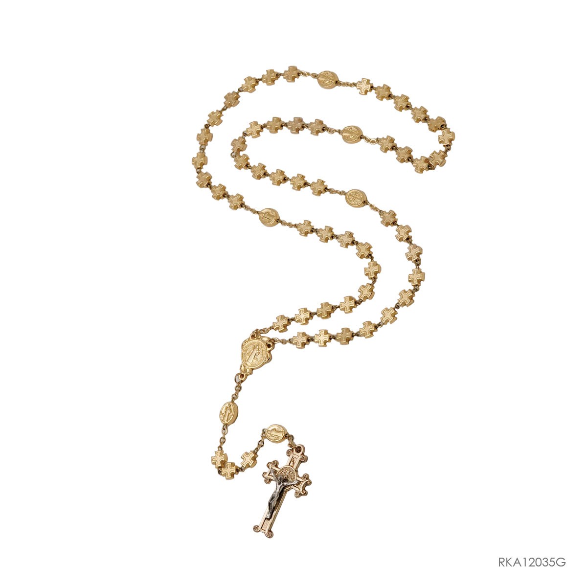 Rosario berbahan metal ini memiliki centre dengan gambar St. Benediktus dan bentuk butiran yang unik pada rosario ini yaitu berbentuk salib. Rosario ini memberikan kesan mewah karena berwarna gold. Cocok juga untuk berikan kepada orang-orang yang terkasih.