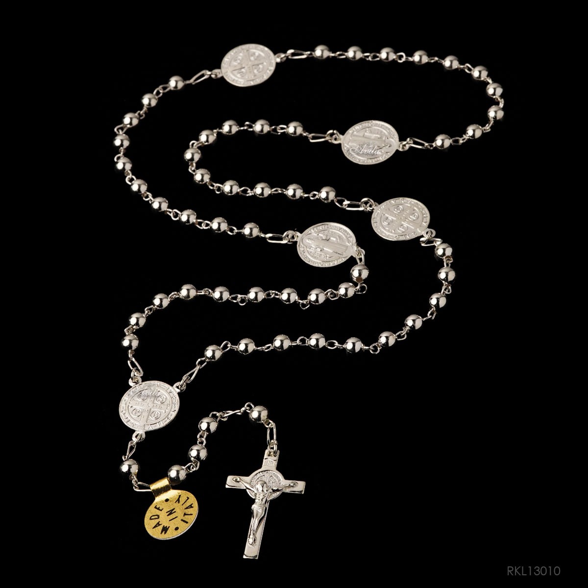 Rosario ini dibuat dari perak murni 925, dengan ukuran manik 5mm yang kecil dan elegan, dipadukan dengan lambang St. Benedictus—salah satu santo pelindung umat Katolik yang terkenal dengan doa perlindungan dan kekuatan rohaninya. Rosario ini bukan hanya alat doa biasa, melainkan juga penjaga iman dan perisai spiritual yang lembut namun kuat.