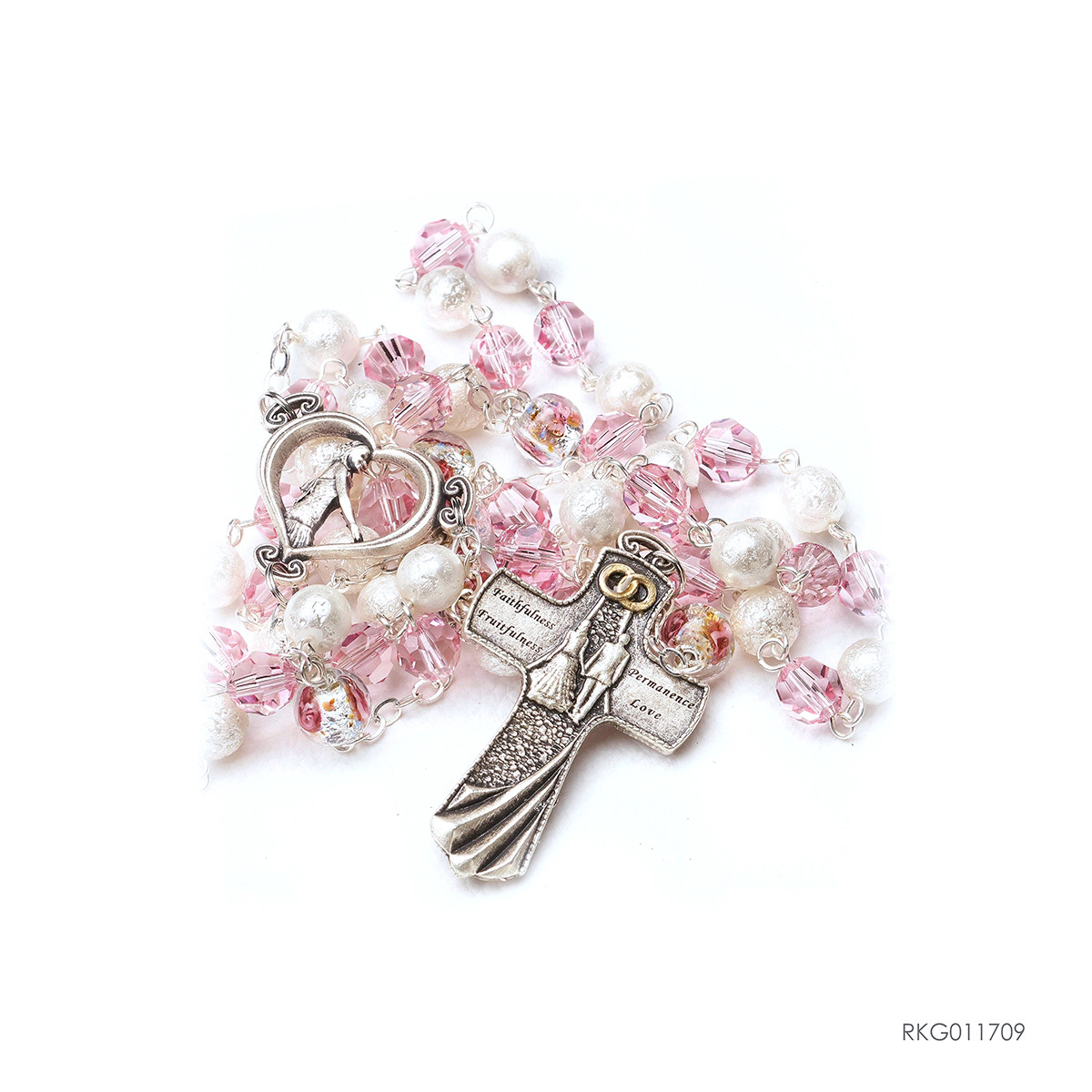 Rosario ini memiliki butir berbahan glass dengan tone warna merah muda dan putih. Bagian salib pada rosario ini berwarna silver dengan ukiran sepasang pengantin, centernya memiliki bentuk hati karena menyesuaikan dari jenis rosario ini, yaitu rosario wedding. Bagian pater, berupa butir dengan mawar didalamnya, Untuk butir pada rosario ini berwarna merah muda dan putih yang di desain dengan kombinasi glass dan crystal swarovski light rose dan lumen beads.