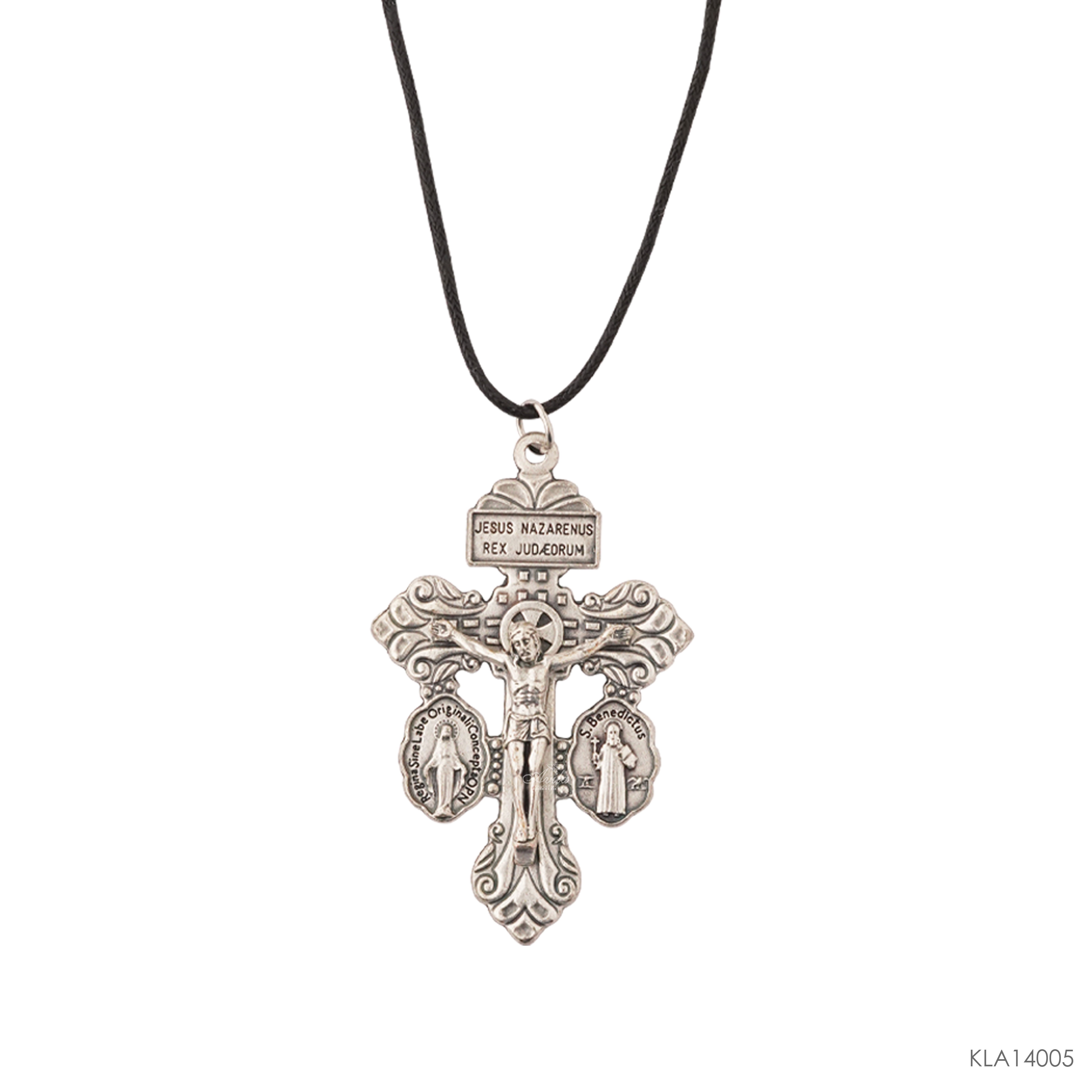 Salib ini memiliki centre dengan simbol medali St. Benediktus, terdapat image Bunda Maria pada bagian kiri salib dan image St. Benediktus di bagian kanan. Corpus pada salib ini terbuat dari bahan metal yang diwarnai dengan warna bronze.