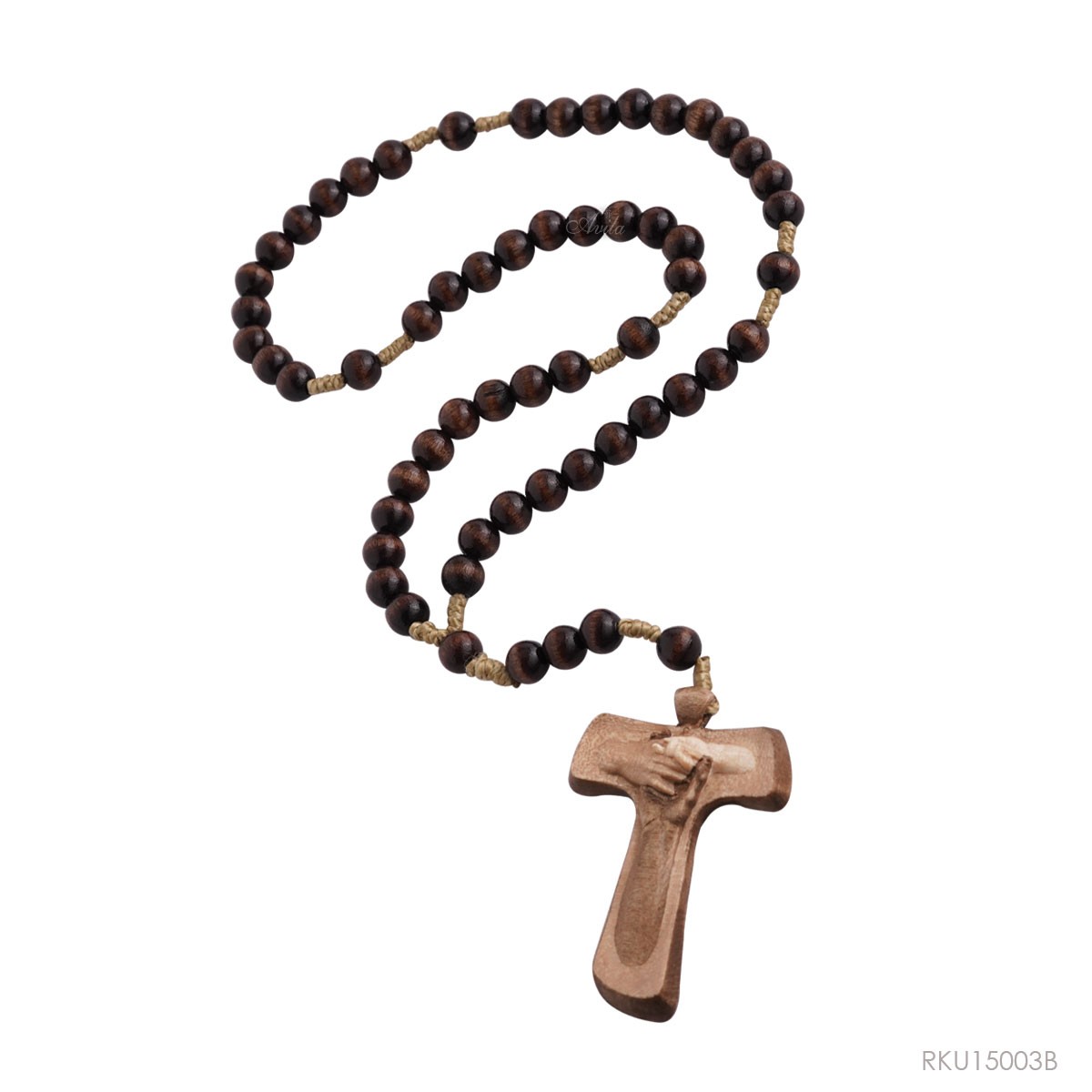 Rosario ini memiliki butiran berbahan dasar kayu alami yang diwarnai coklat serta rangkaiannya yang berbahan dasar benang kuat. Kayu yang dipilih untuk rosario ini memberikan tekstur yang nyaman saat digenggam, serta tahan lama, sehingga cocok untuk penggunaan sehari-hari dalam doa Rosario. Salib yang digunakan pada rosario ini adalah salib Tau, yang melambangkan salib Kristus, pengorbanan, penebusan, dan kesetiaan kepada Yesus, serta mengingatkan umat Kristiani akan panggilan untuk hidup dalam pertobatan, kasih, dan pengampunan.
