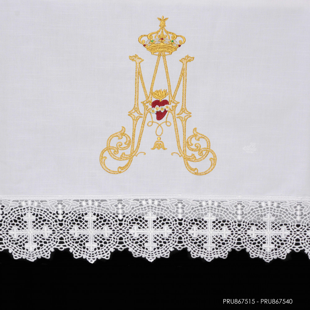Taplak meja altar digunakan untuk melindungi dan mempercantik meja altar yang menjadi tempat perjamuan Kudus. Taplak meja altar ini memiliki motif berupa mahkota Hati Kudus. Dibuat dari bahan terbaik di Italia.